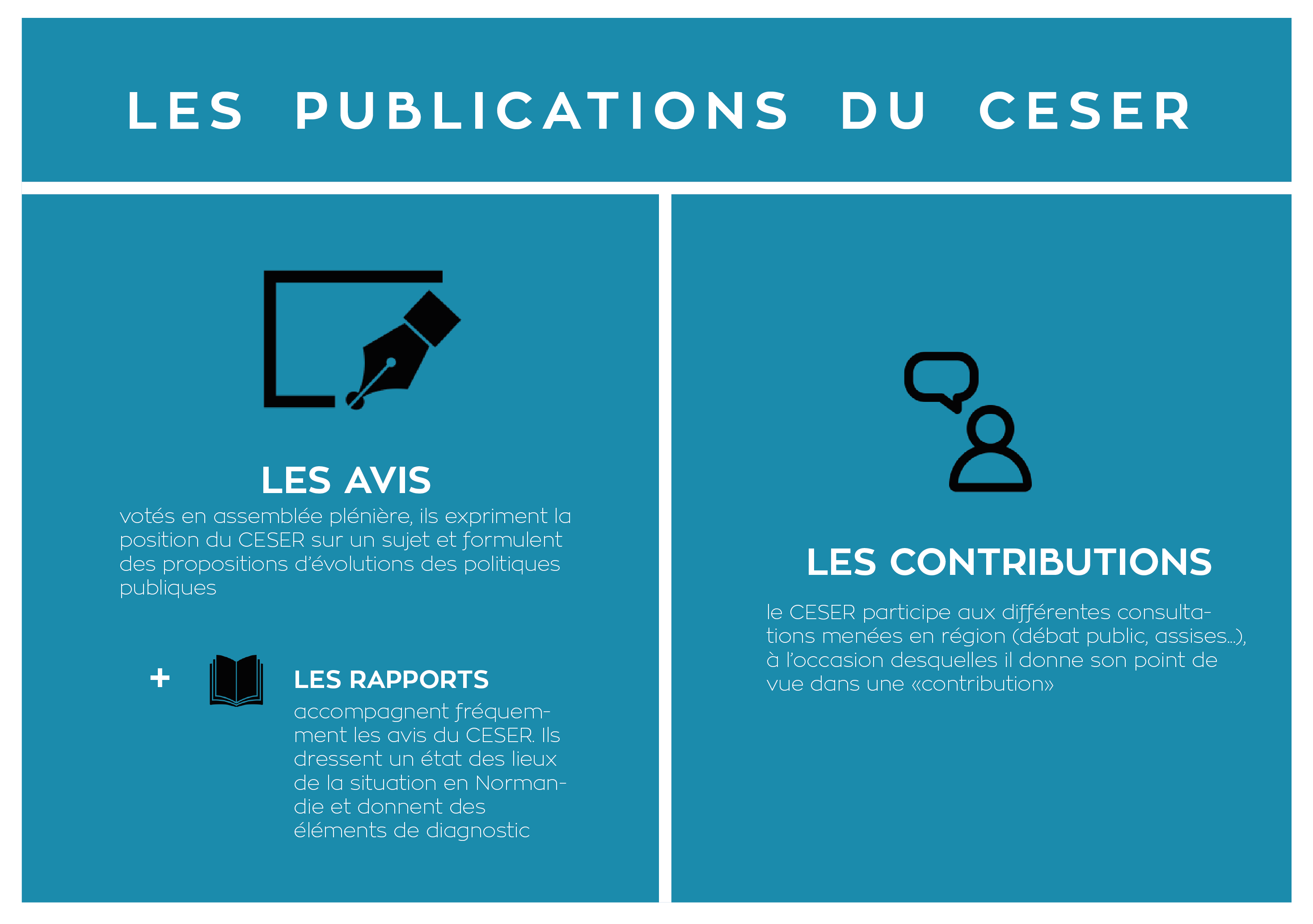 Le CESER s’exprime sur l’ensemble des sujets d’intérêt régionaux (formation, développement économique, transport, culture, santé, environnement…), et privilégie une approche par le développement durable. Il ajoute à ses travaux une vision prospective de la Normandie et s’attache à systématiquement faire le lien entre les préoccupations des citoyens et leur traduction concrète dans l’action publique. Depuis 2015, il est également en mesure de contribuer à l’évaluation des politiques publiques. La loi 3DS, votée le 21 février 2022, complète les missions des CESER en leur confiant la conduite d’études de prospective territoriale régionale.